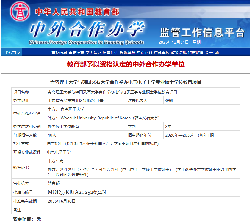 12月31日,教育部公布了2025年下半年申报的中外合作办学机构/项目批复结果,青岛理工大学与韩国又石大学合作举办的电气电子工学硕士项目,正式通过教育部资格认定并在中外合作办学监管工作信息平台公布。该项目不仅是我校首个硕士层次中外合作办学项目,也是山东省内电气工程领域首个同类硕士项目。